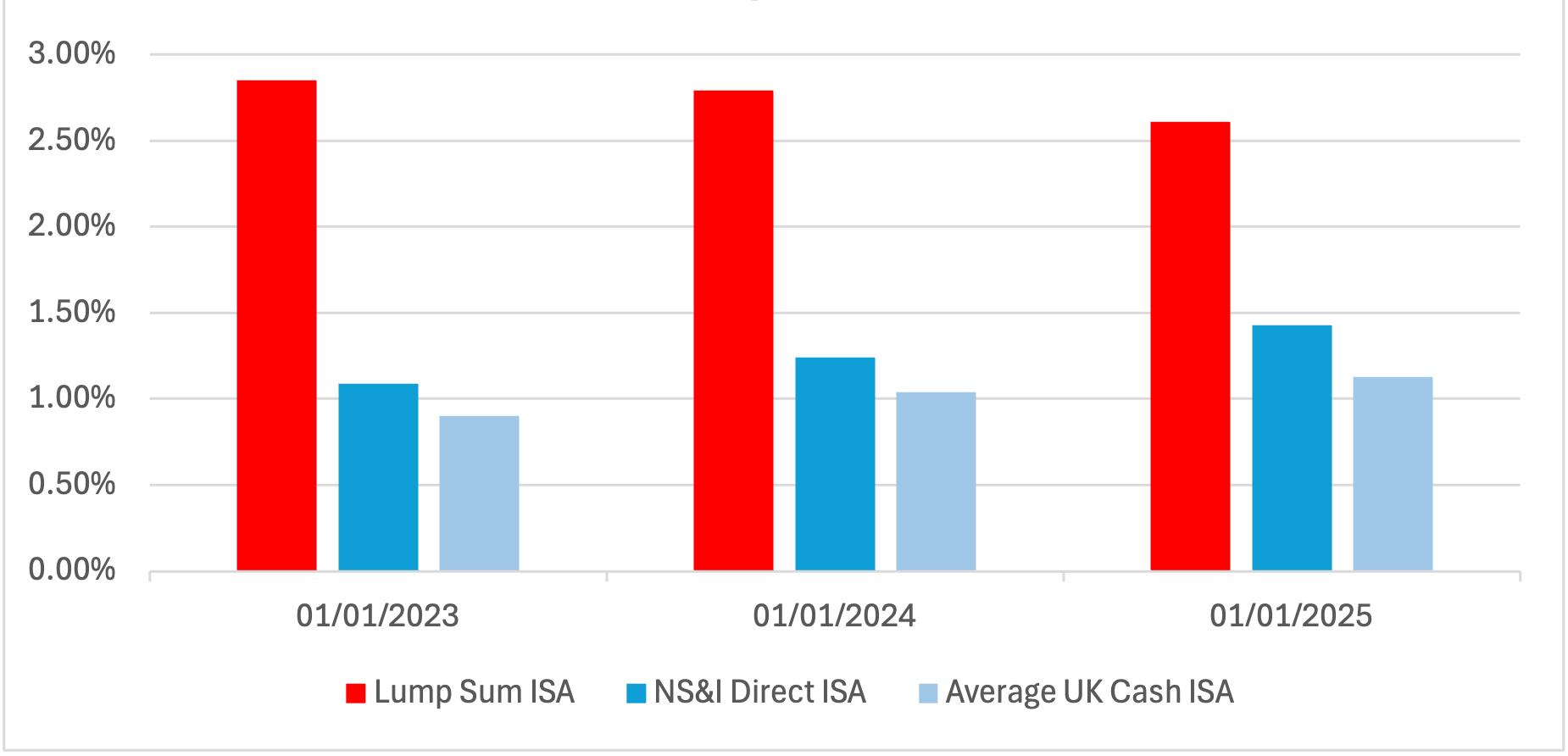 You can save up to £20,000 per tax year into our Lump Sum ISA, tax-free, with the potential of higher returns over the medium/long term than a cash ISA. The graph below shows how our Lump Sum ISA performed compared to the NS&I Direct ISA and the average UK Cash ISA.